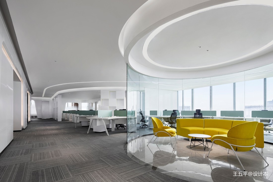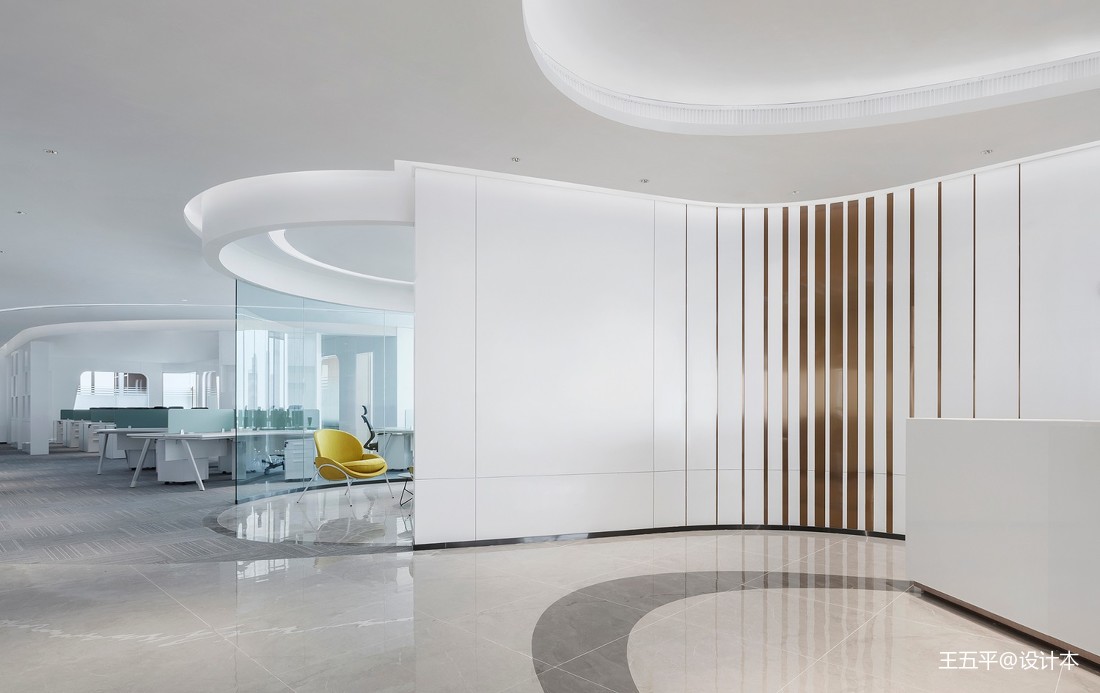 俯瞰空間,光陰交織,線面糅合。曲線元素打破呆板和無趣,賦予空間多變性。弧度背景緩解空間突兀感,將空間柔化,并貫穿空間每一個角落。簡單而充滿未來感的燈具,在低調中,卻成為另一亮點,迸發著設計師的創意與靈感。開放式的空間,辦公、洽談或是端詳風景,洋溢著的高端與時尚,溢于言表。